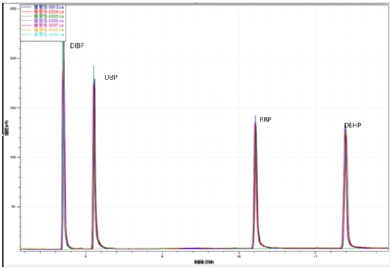 圖2. 4種鄰苯二甲酸酯標(biāo)準(zhǔn)溶液線性譜圖疊加