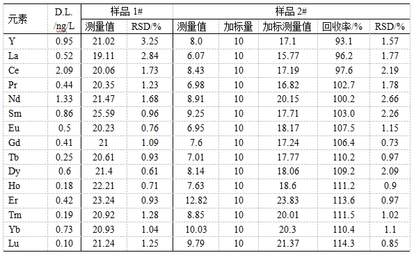 參考《GB/T 18115.1-2020 稀土金屬及其氧化物中稀土雜質(zhì)化學(xué)分析方法 第1部分:鑭中鈰、鐠、釹、釤、銪、釓、鋱、鏑、鈥、餌、銩、鐿、镥和釔量的測定》,將高純氧化鑭用稀硝酸溶解,利用內(nèi)標法進行校正。考察加標回收率及精密度。方法加標回收率為98.9%~116.9%,精密度為0.28%~9.20%。