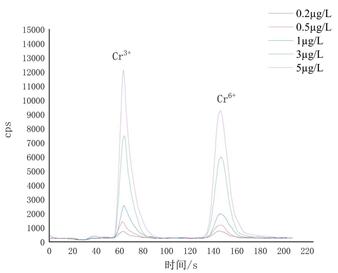 依次進(jìn)樣測(cè)試0.2 μg/L、0.5 μg/L、1 μg/L、3 μg/L、5 μg/L Cr3+和Cr6+混合標(biāo)準(zhǔn)溶液,分離度R>1.5,完全分離。