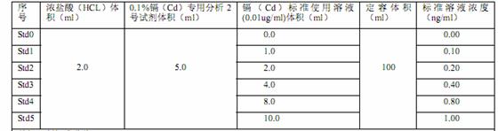 使用鎘(Cd)標(biāo)準(zhǔn)使用溶液(0.01ug/ml),優(yōu)級(jí)純鹽酸(HCL) ,0.1%鎘(Cd)專用分析 2 號(hào)試劑,去離子水(電阻率≥10M歐姆)等試劑。