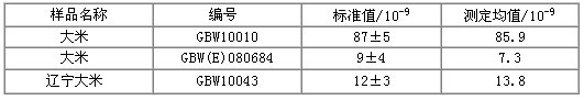 選用三種國家標(biāo)準(zhǔn)大米樣品進(jìn)行樣品消解及樣品測試,測試結(jié)果如表1所示: