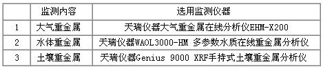 綜上所述,有色金屬礦業(yè)對環(huán)境的重金屬污染包括了大氣、水體和土壤三個方面。因此,為了全面監(jiān)測有色金屬礦業(yè)環(huán)境重金屬監(jiān)測系統(tǒng)包括:大氣、水體和土壤三個部分,選用監(jiān)測儀器如下表: