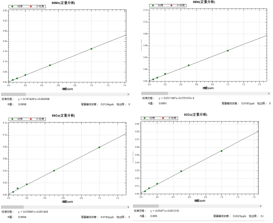 冷焰模式下,繪制各元素0,0.05,0.1,0.2,0.5,1.0μg/L系列濃度標液工作曲線,39K、40Ca、56Fe等同位素的線性相關(guān)系數(shù)r均大于0.999,背景等效濃度為0.0023μg/L~0.0217μg/L。