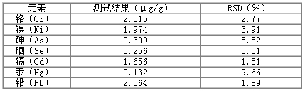 Hg標(biāo)液單獨為一組。Cr 、Ni 、As 、Se 、Cd 和Pb 標(biāo)液用各元素10μg/mL的標(biāo)液稀釋至所需濃度。配制Hg標(biāo)液時加入0.1mL 20 μg/mL金標(biāo)準(zhǔn)溶液。分析結(jié)果(表2)顯示,這7種元素的線性方程的相關(guān)系數(shù)為0.9996~1.000 ,檢出限為0.008~0.165ng/mL。