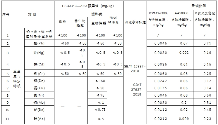 針對剛正式實(shí)施的快遞包裝首個(gè)國標(biāo),參考GB43352標(biāo)準(zhǔn),采用ICP-MS2000E測定快遞塑料包裝袋中鉛汞鎘鉻等十項(xiàng)金屬元素,各元素檢出限在0.012~0.097μg/L,加標(biāo)回收率在94.4%~102.2%之間,精密度在1.15%~6.60%之間;各元素測量值均在國標(biāo)要求的限值范圍內(nèi)。本實(shí)驗(yàn)結(jié)果表明該方法具有良好的穩(wěn)定性及精密度,完全滿足快遞塑料包裝袋中重金屬元素的測定。