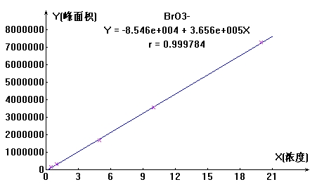按照溴酸根各濃度點依次進樣,計算其峰面積,以濃度和峰面積繪制標(biāo)準(zhǔn)曲線,線性相關(guān)系數(shù)為0.9997,結(jié)果詳見圖2。
