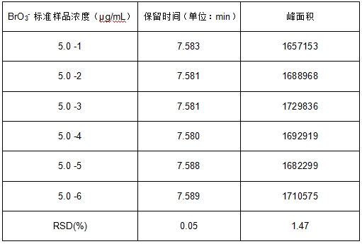 取5.0μg/mL溴酸根標(biāo)準(zhǔn)溶液重復(fù)進樣6次,考察保留時間和峰面積的重現(xiàn)性,重現(xiàn)性結(jié)果詳見表3。